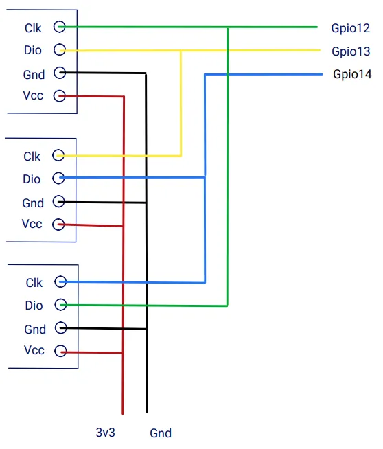 When using more than 2 devices like 3 or more you add a control-line for the Dio pin and share this with the next display Clk pin. The last displays Dio pin shares the Clk pin of the first display.