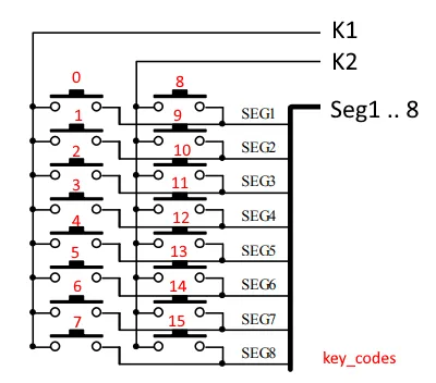 The TM1637 LED display controller also includes a special circuit with keyboard scan interface and enhanced identification circuit with anti-interference keys. This circuit uses the 8 segment lines that also drive the LED display. But combined with the K1 and K2 pins we can add 16 keys that can be used as binary sensors in esphome.